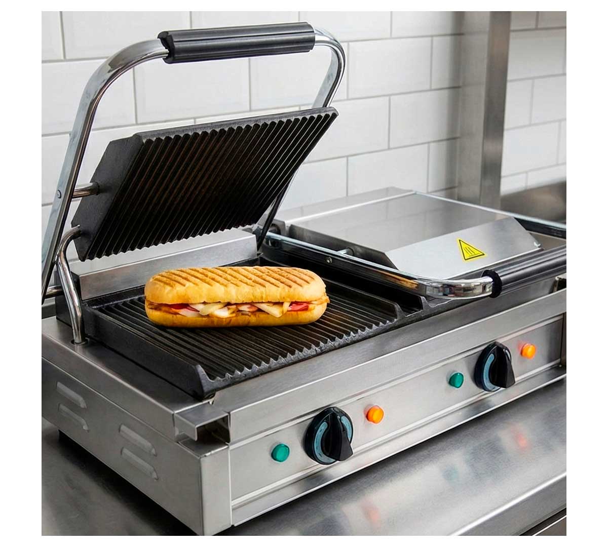La Plancha Grill Piastra Panini Doble de Romagsa tiene un diseño robusto y de mayor capacidad. Permite preparar de forma simultánea diferentes alimentos. Es ideal para sándwiches y paninis en cafeterías y negocios de hostelería.