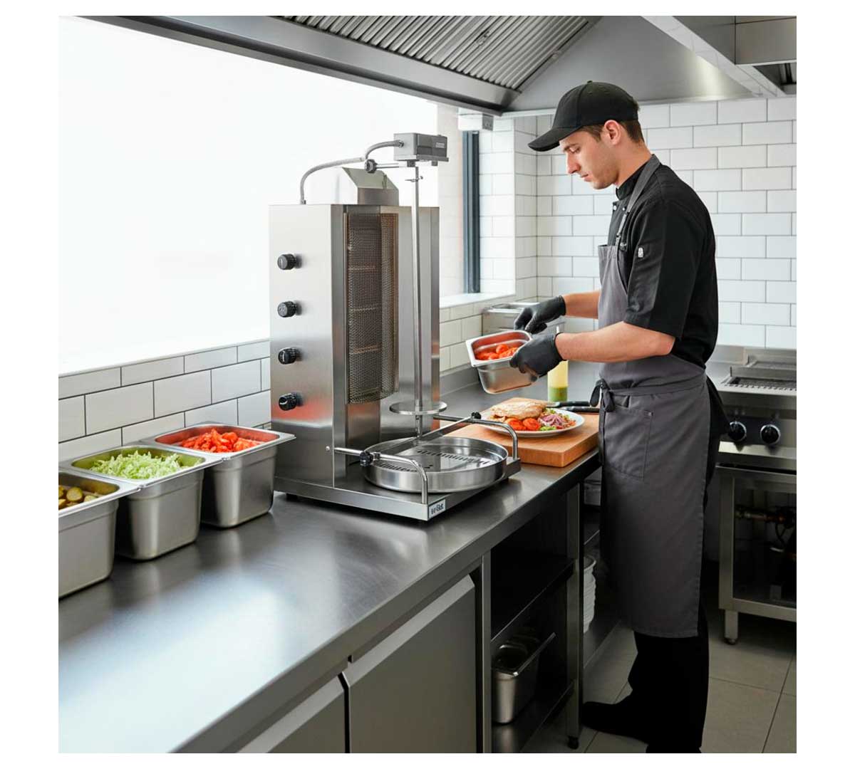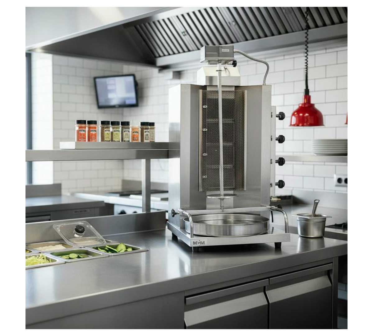 Doner kebab grill a gas, fabricado en acero inoxidable con 4 quemadores. Equipado con motor vertical superior y espada con capacidad de 35 kg.