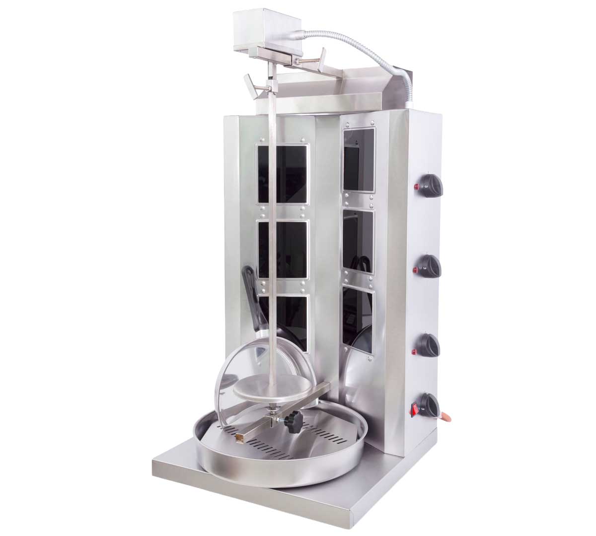 Asador kebab eléctrico profesional con resistencias vitrocerámicas Schott y capacidad de hasta 40 kg, sistema de cocción vertical con regulación por zonas, diseñado para restaurantes, kebab y fast food. Gama intermedia-alta para producción continua y control preciso del asado. Es necesario pedir el cuchillo eléctrico por separado.