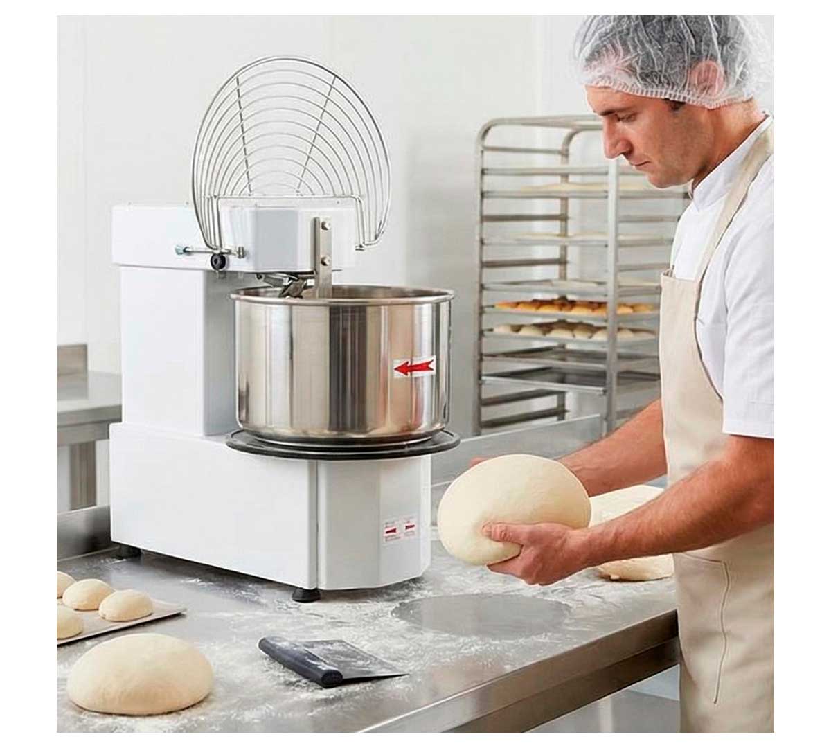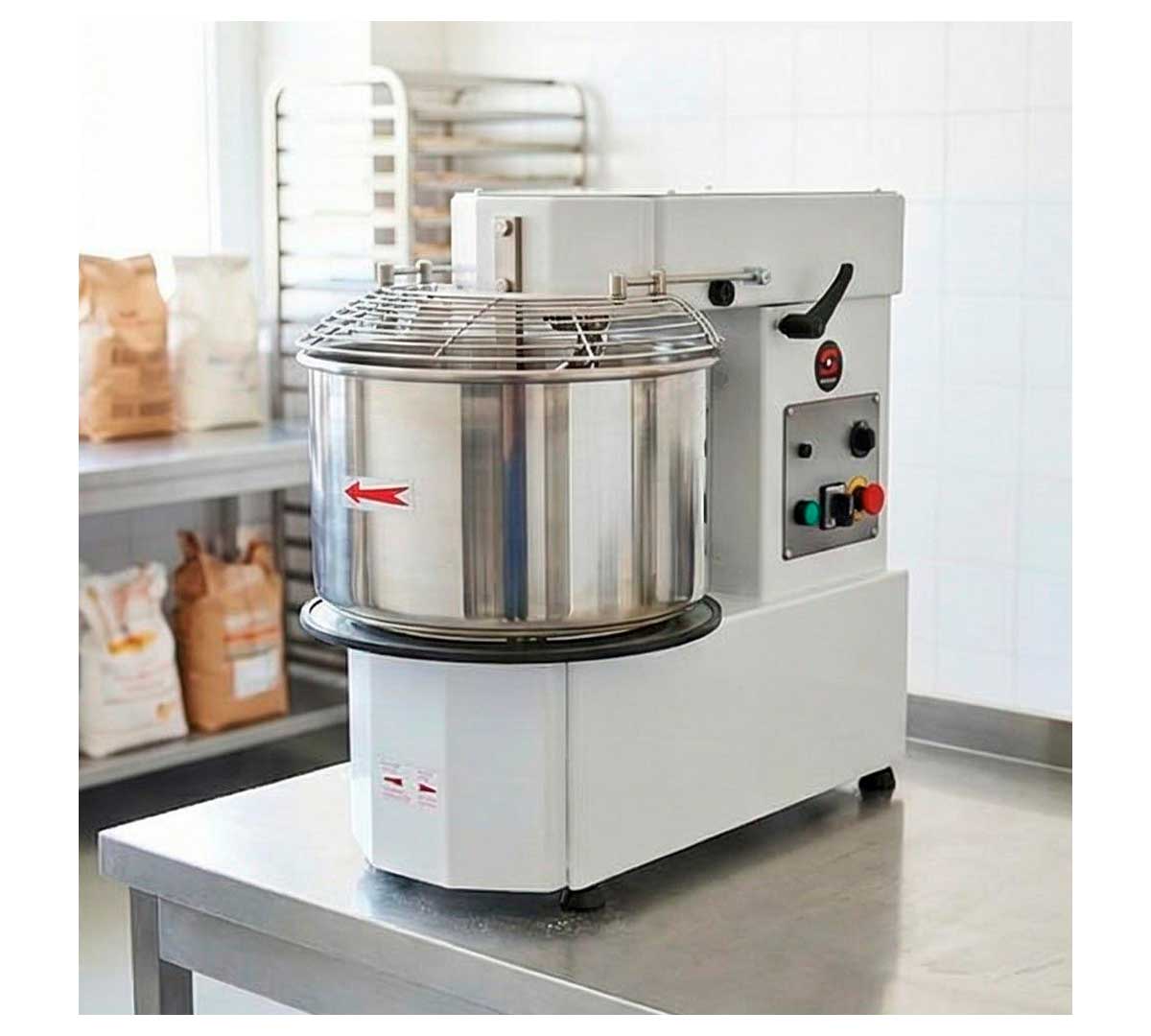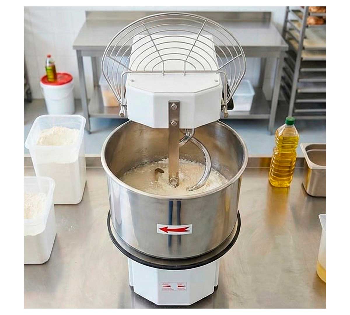Amasadora de espiral especialmente indicada para masas duras de pizza, pan, etc. Tiene una velocidad, con cabezal y caldero fijos. Está disponible en dos modelos con capacidad de cuba de 20 o 33 litros. Puede amasar 18 o 25 kg, según modelo.