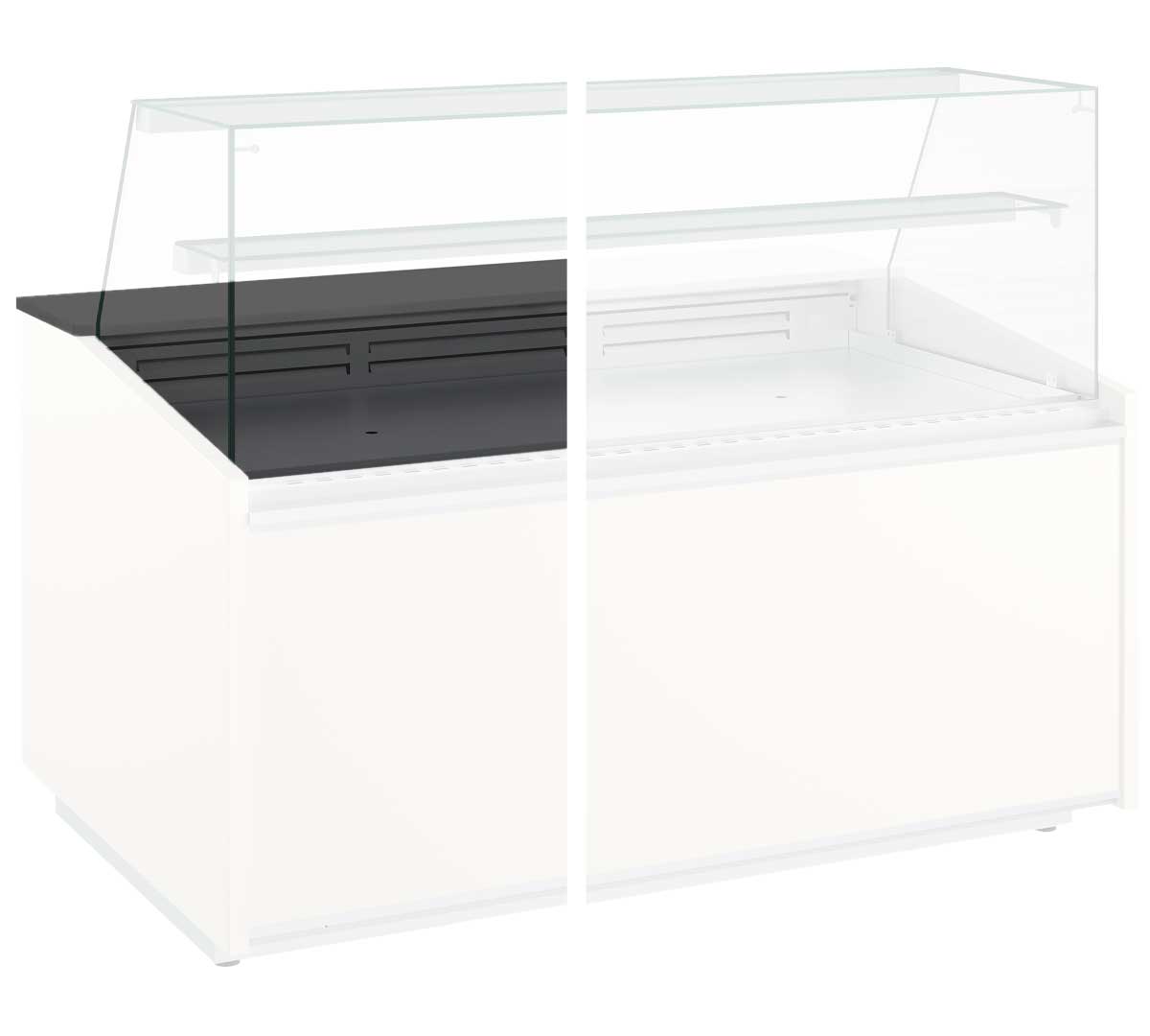 Vitrina frigorífica expositora diseñada para pastelería, con cristal securizado recto y frontal fijo. Tiene una temperatura de trabajo entre 0 y 6 °C. Su estructura incluye encimera de cuarzo blanco, plano de exposición en acero inoxidable, iluminación LED bajo la encimera y columnas de vidrio. Incluye 1 estante de cristal con iluminación, no refrigerado. Está disponible en 19 colores.