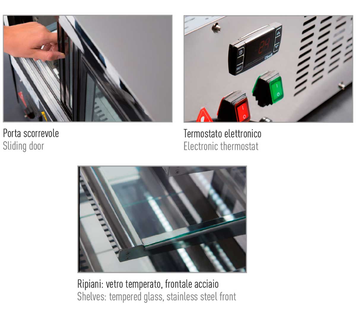 Este expositor refrigerado, también conocido como vitrina pastelera, destaca por su estructura robusta y su interior en acero pulido, que proporciona un atractivo efecto espejo y realza la presentación de los productos.