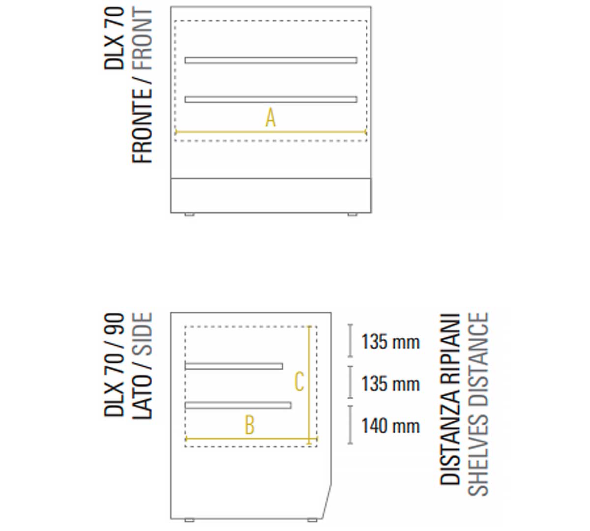 El modelo DLX 70 es una vitrina refrigerada para barra de bar pequeña de 130 litros con control digital e interior efecto espejo, ideal para exposición refrigerada en mostradores de Hostelería.