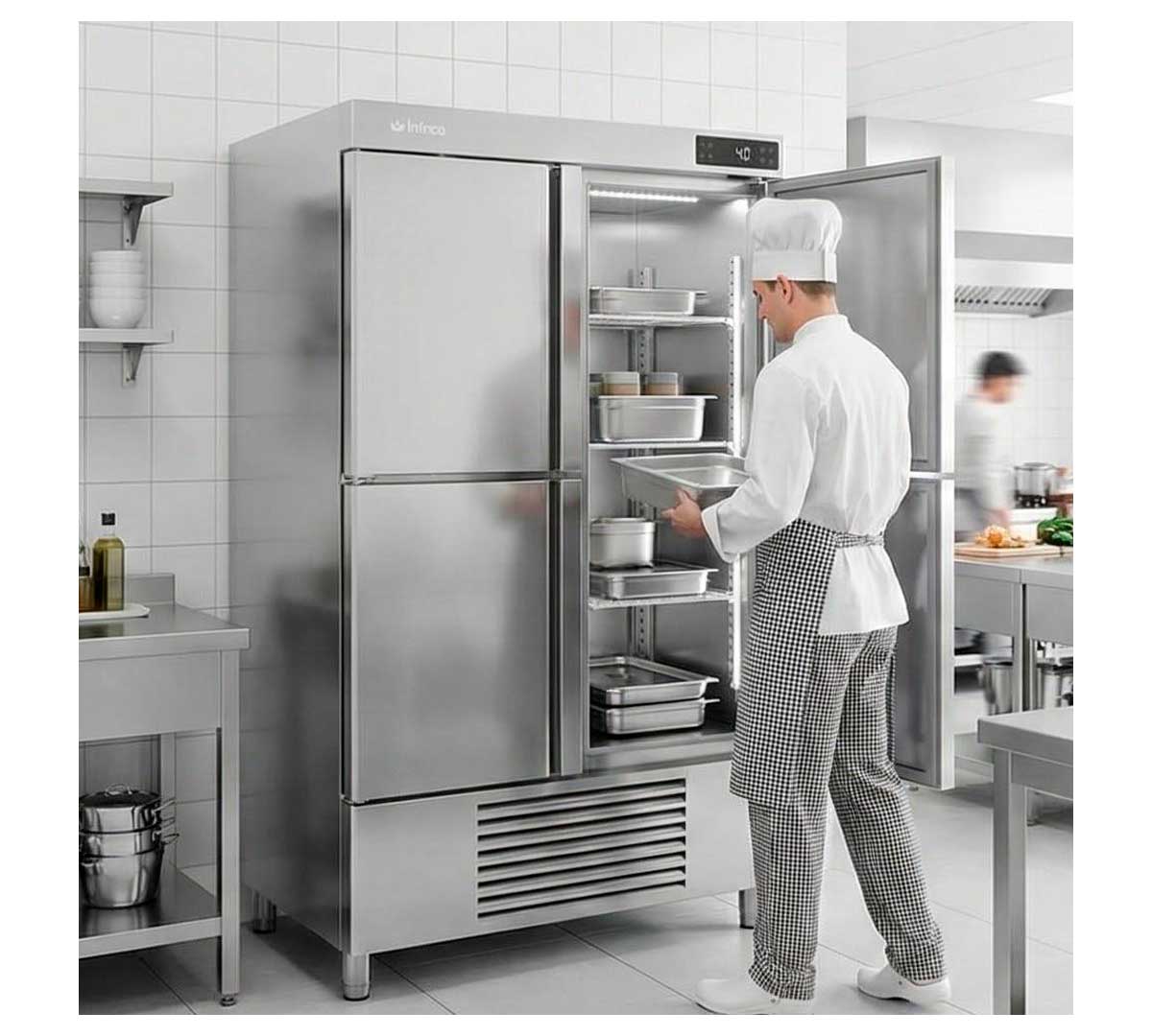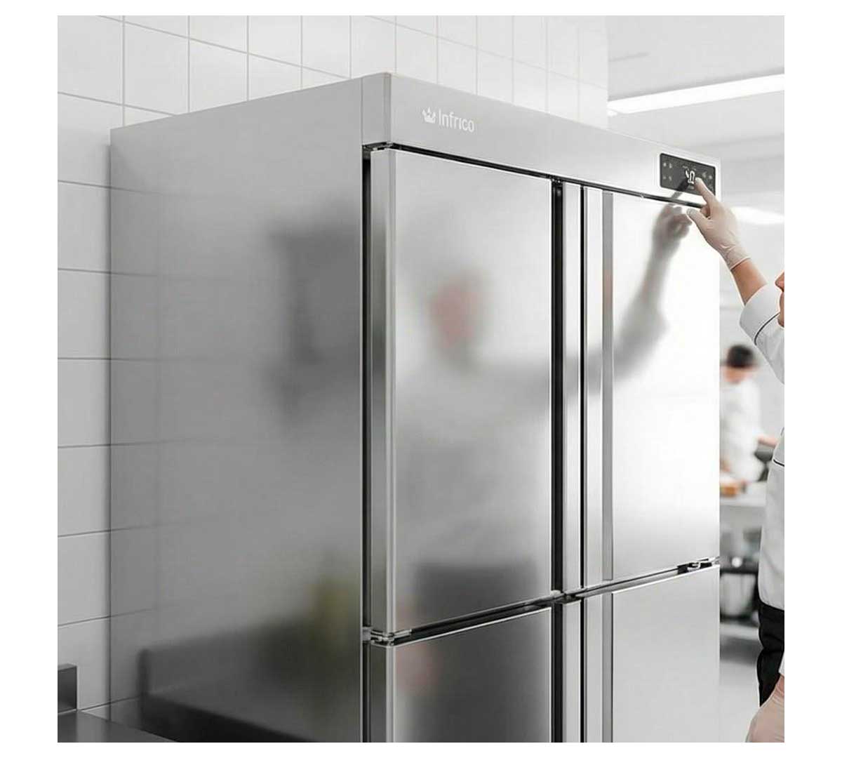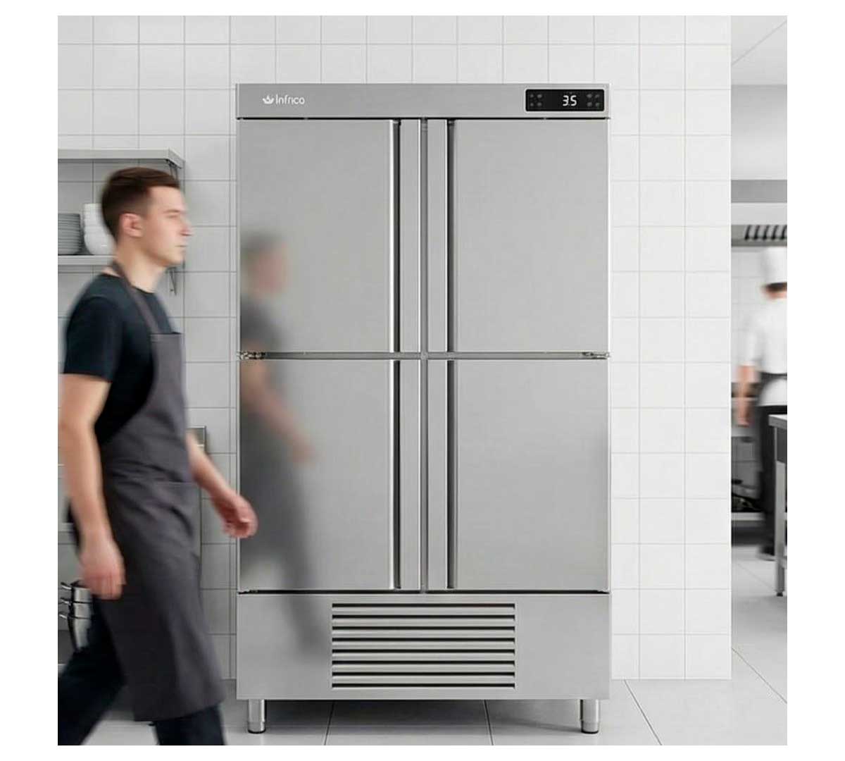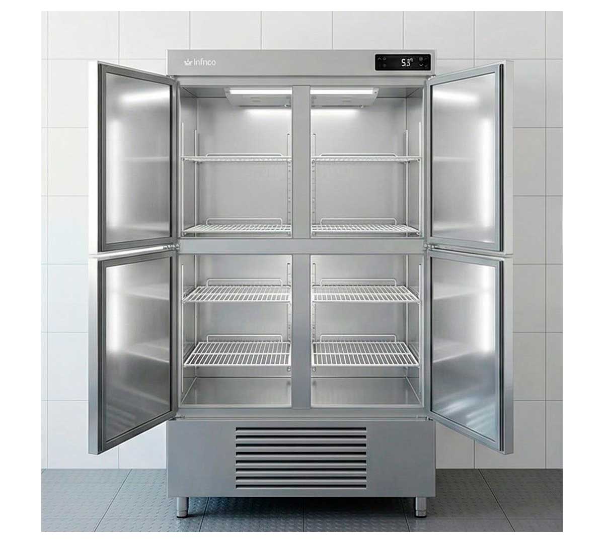 Armario frigorífico con 4 medias puertas opacas. Tiene controlador digital táctil, iluminación LED y el sistema de frío es ventilado. Permite un rango de temperatura de -2º a 8 ºC. Incluye 6 parrillas 60 x 40 cm y 6 juegos de guías. Con tecnología inverter que reduce el consumo de energía hasta un 40% en comparación con un compresor fijo (on-off).