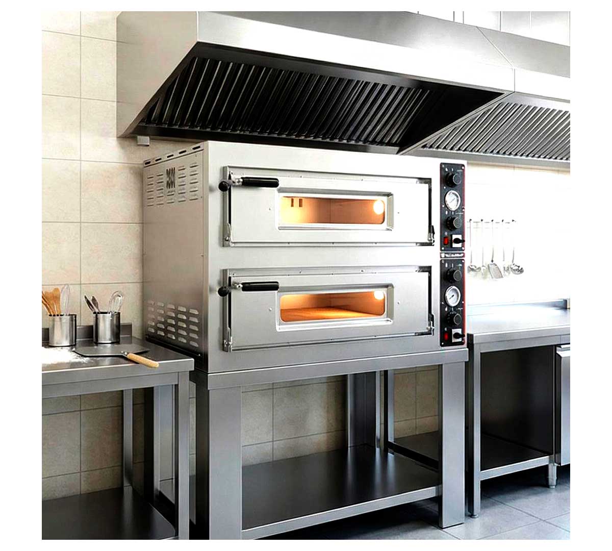 Horno eléctrico con 2 cámaras. La superficie de cocción es de ladrillo refractario. Tiene resistencias en la parte superior e inferior de cada cámara. Equipado con termómetro analógico, luz interior y aislamiento térmico.