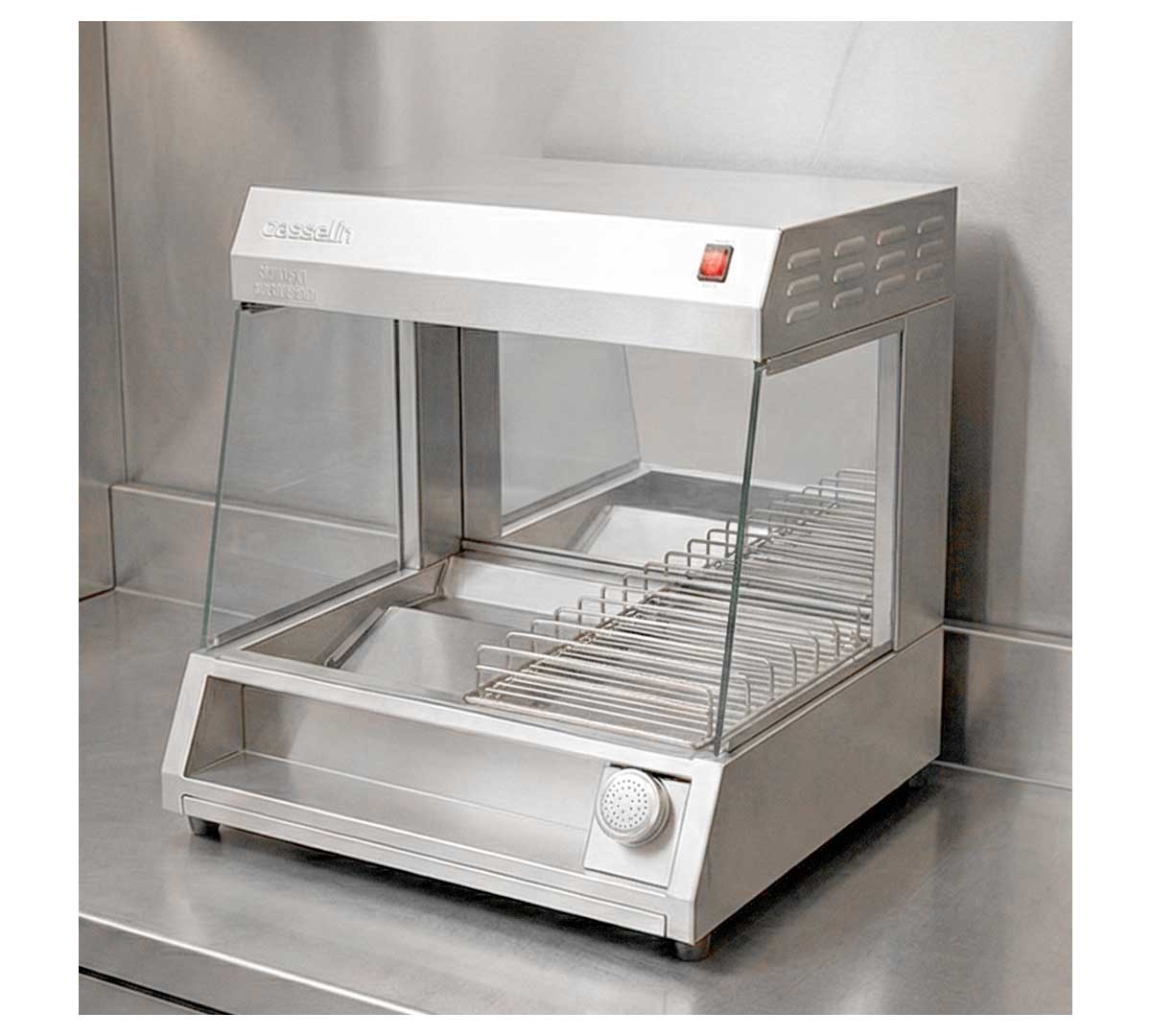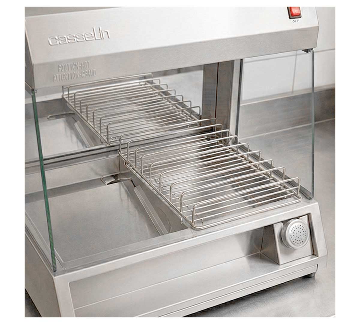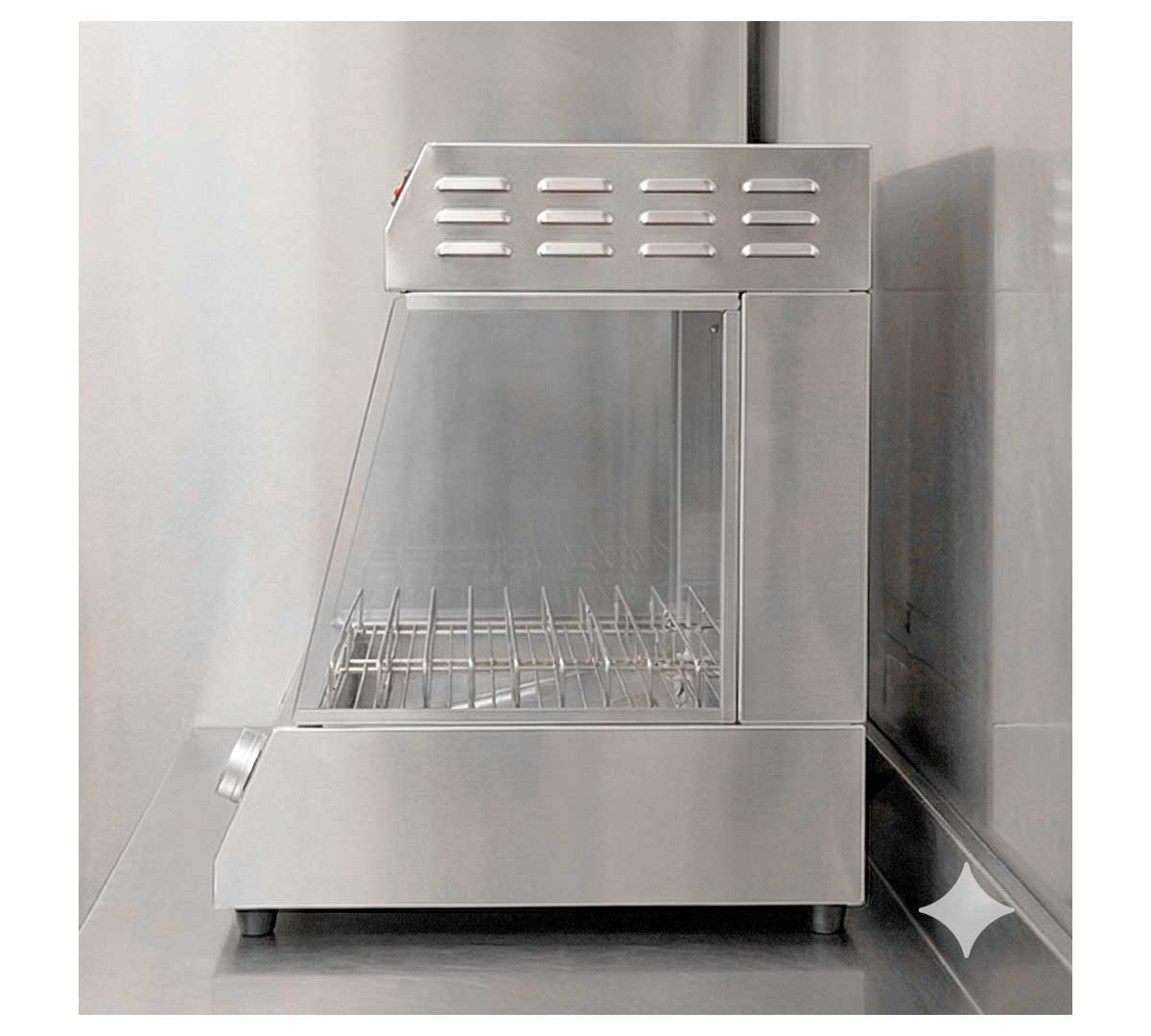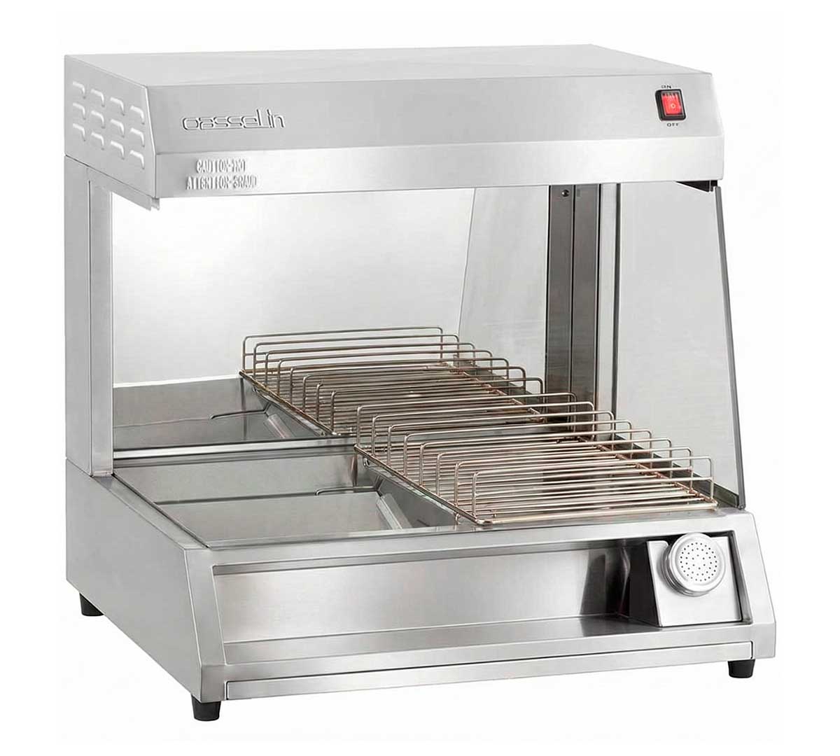 Estación de patatas fritas de sobremesa compuesto por una rejilla y panel de vidrio cambiables para la izquierda/ derecha. Incluye salero y una rejilla con 7 estantes separadores.