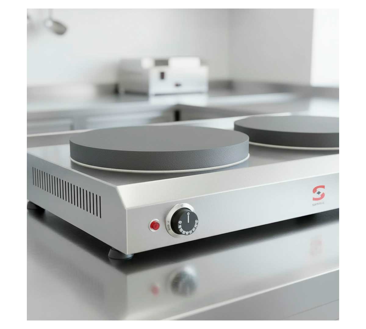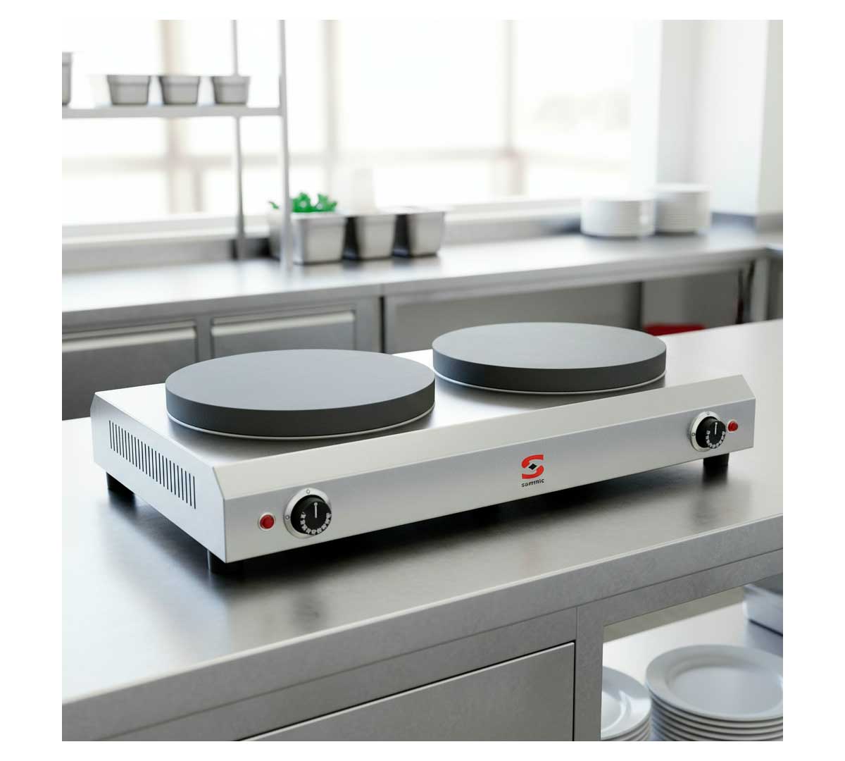 La Crepera Doble a Gas CG-240 de Sammic está fabricada en acero inoxidable. La superficie de las placas son de hierro colado y tienen un tratamiento antiadherente. La forma especial de los quemadores, garantiza una distribución uniforme del calor por toda la placa.