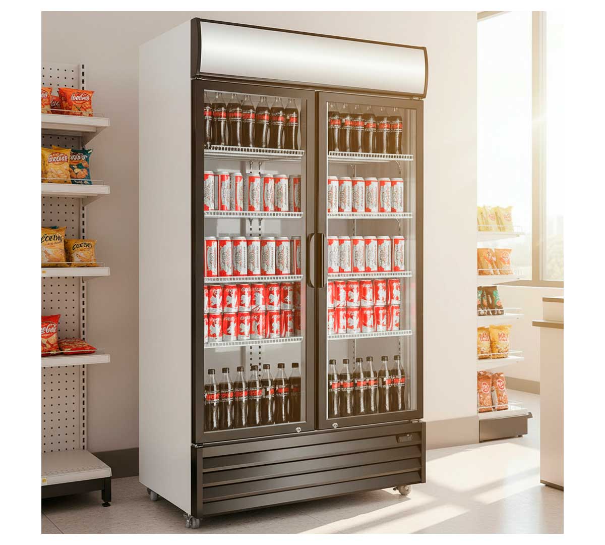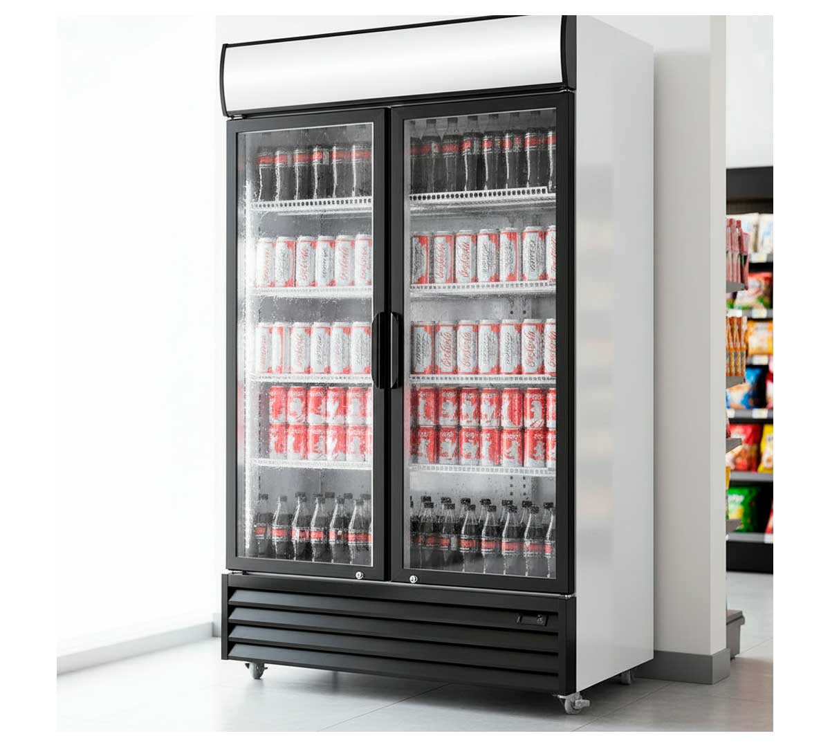 Armario expositor frigorífico con dos puertas de cristal abatible. Equipado con 8 estantes regulables y termostato electrónico digital. De gran superficie visible con luz LED interior. El sistema de refrigeración es ventilado con grandes ventiladores en el interior. Tiene una capacidad de 1.000 litros.
