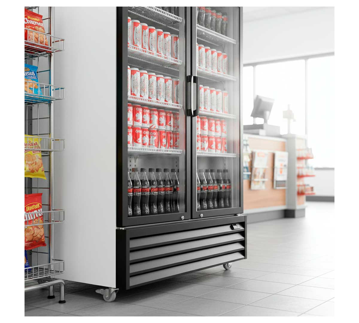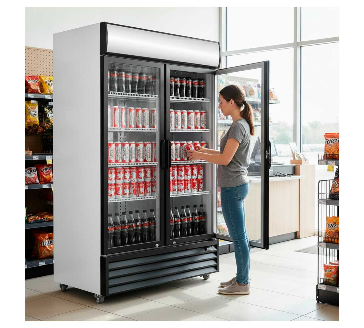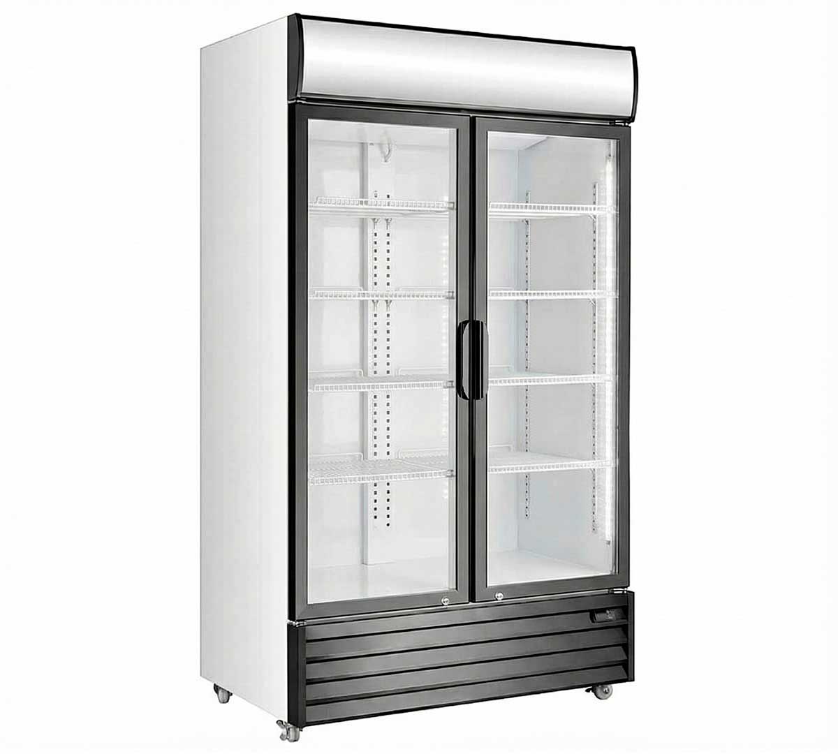 Armario expositor frigorífico con dos puertas de cristal abatible. Equipado con 8 estantes regulables y termostato electrónico digital. De gran superficie visible con luz LED interior. El sistema de refrigeración es ventilado con grandes ventiladores en el interior. Tiene una capacidad de 1.200 litros.