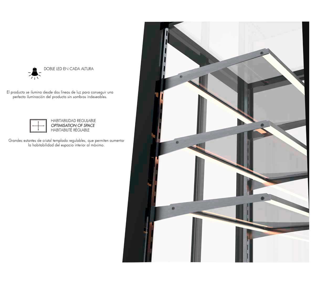 La línea Integra permite combinar módulos fríos, neutros y calientes con el mismo diseño y acabado, ofreciendo gran flexibilidad para personalizar la zona de exhibición según las necesidades del negocio.