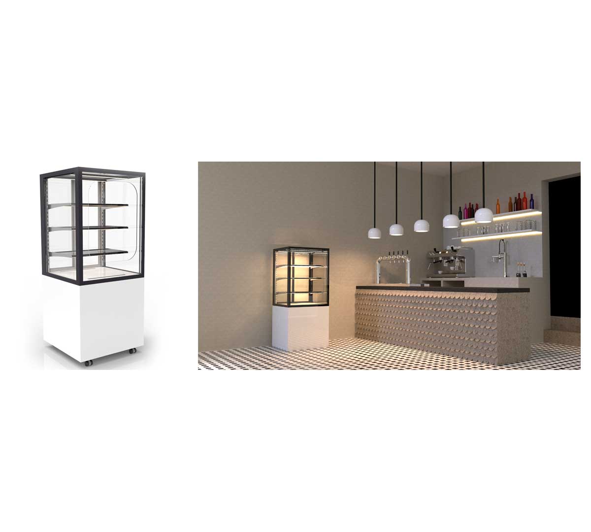 Vitrina expositora refrigerada que permite una visibilidad perfecta. De diseño versátil que permite exponer una gran variedad de productos como postres, bebidas, snack, etc. La base mide 60 cm de ancho. El acceso es trasero. Con iluminación doble. Está disponible en color blanco o negro.