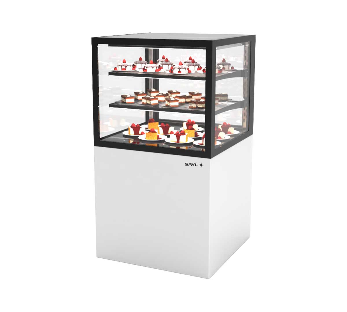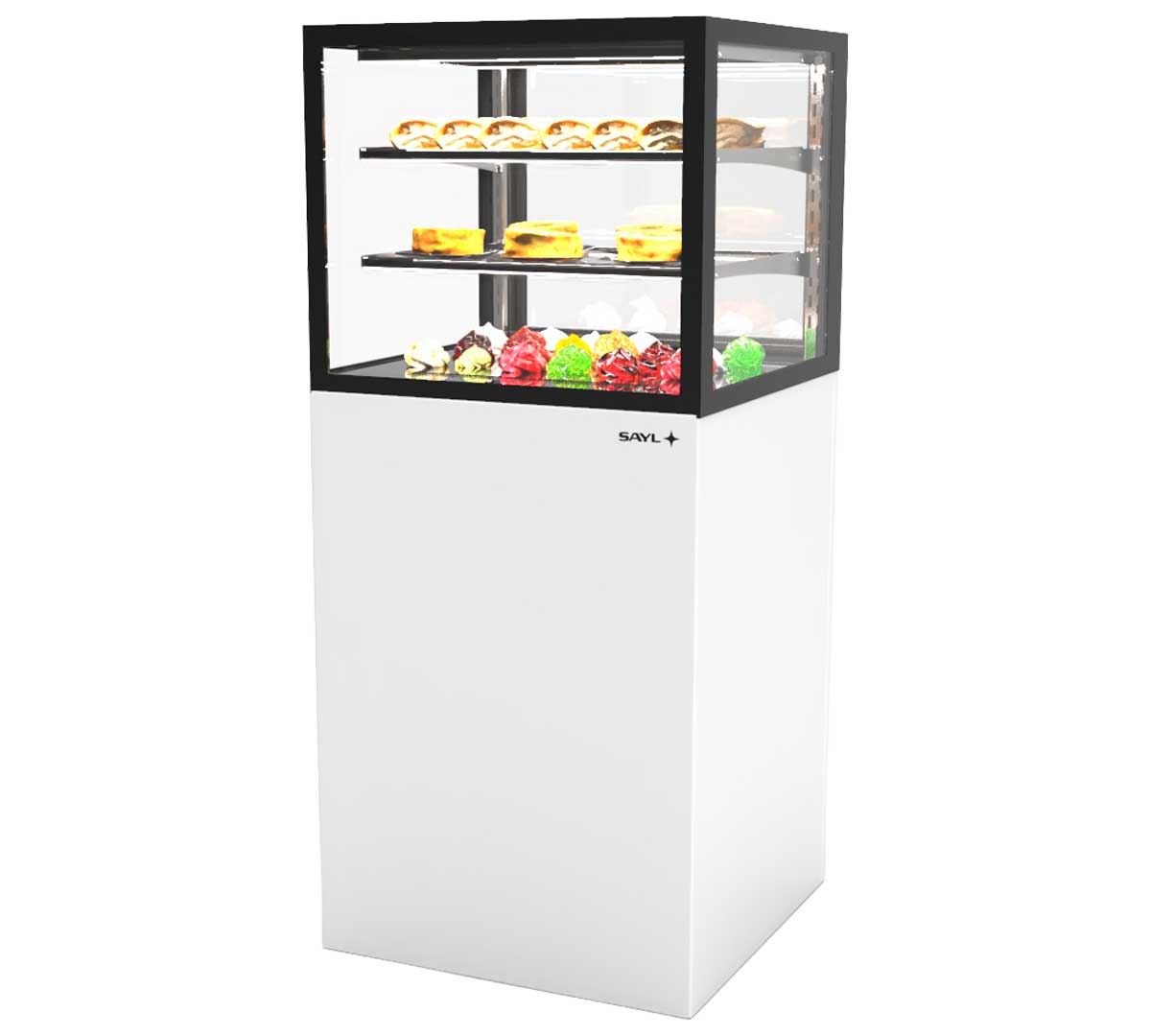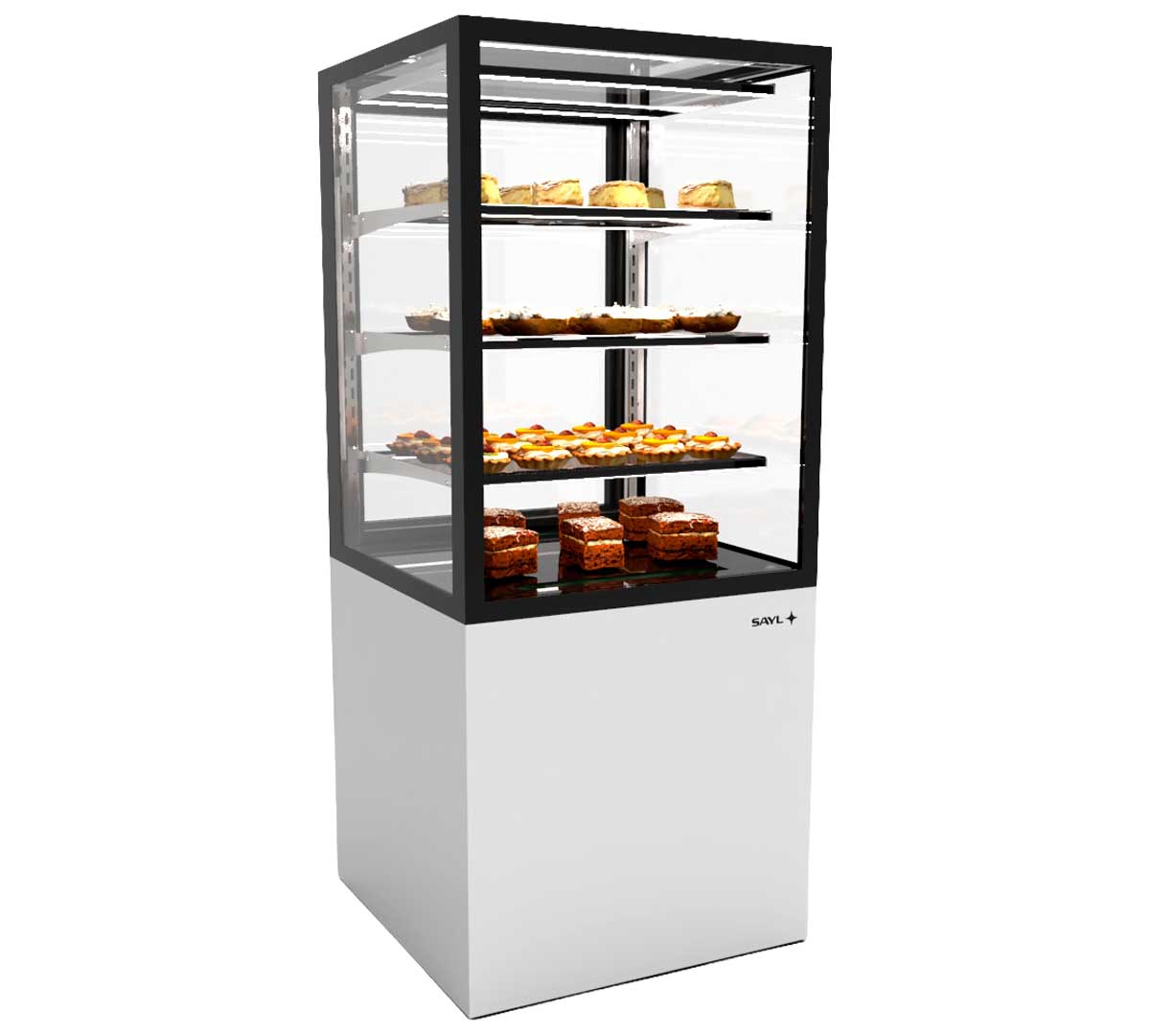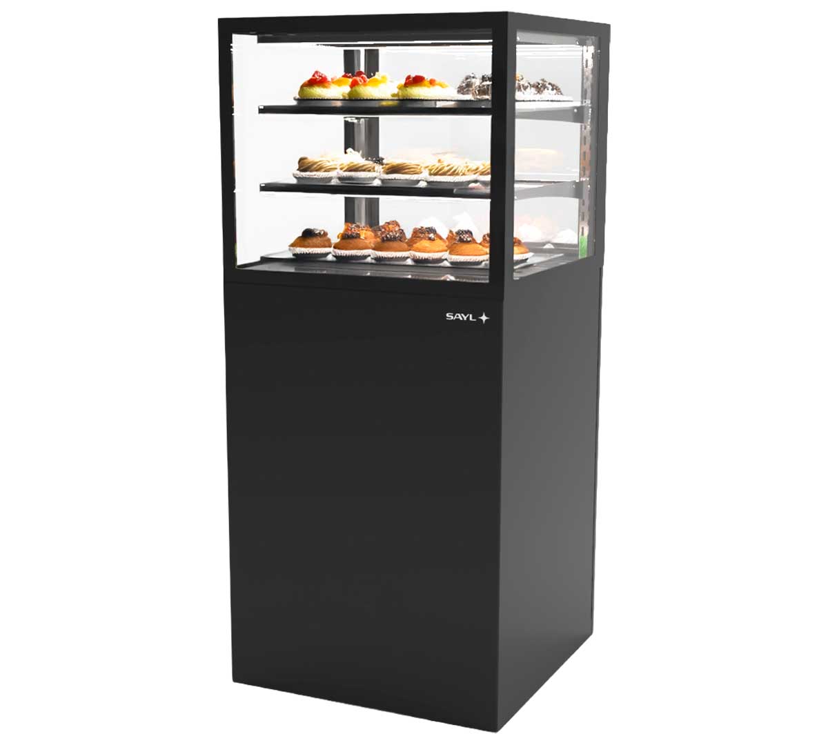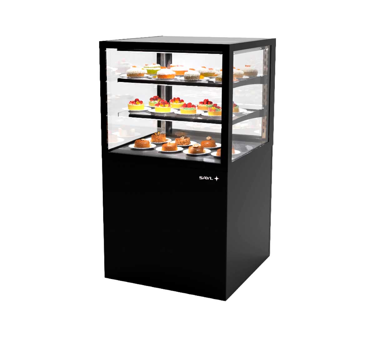 La Vitrina Expositora Integra con Base 60 de Sayl tiene una base de 60 cm de ancho. Es una solución avanzada para la exposición y conservación de productos en negocios de restauración y alimentación.