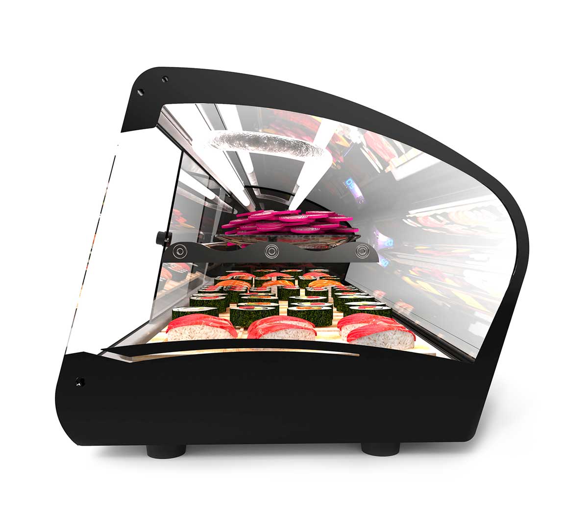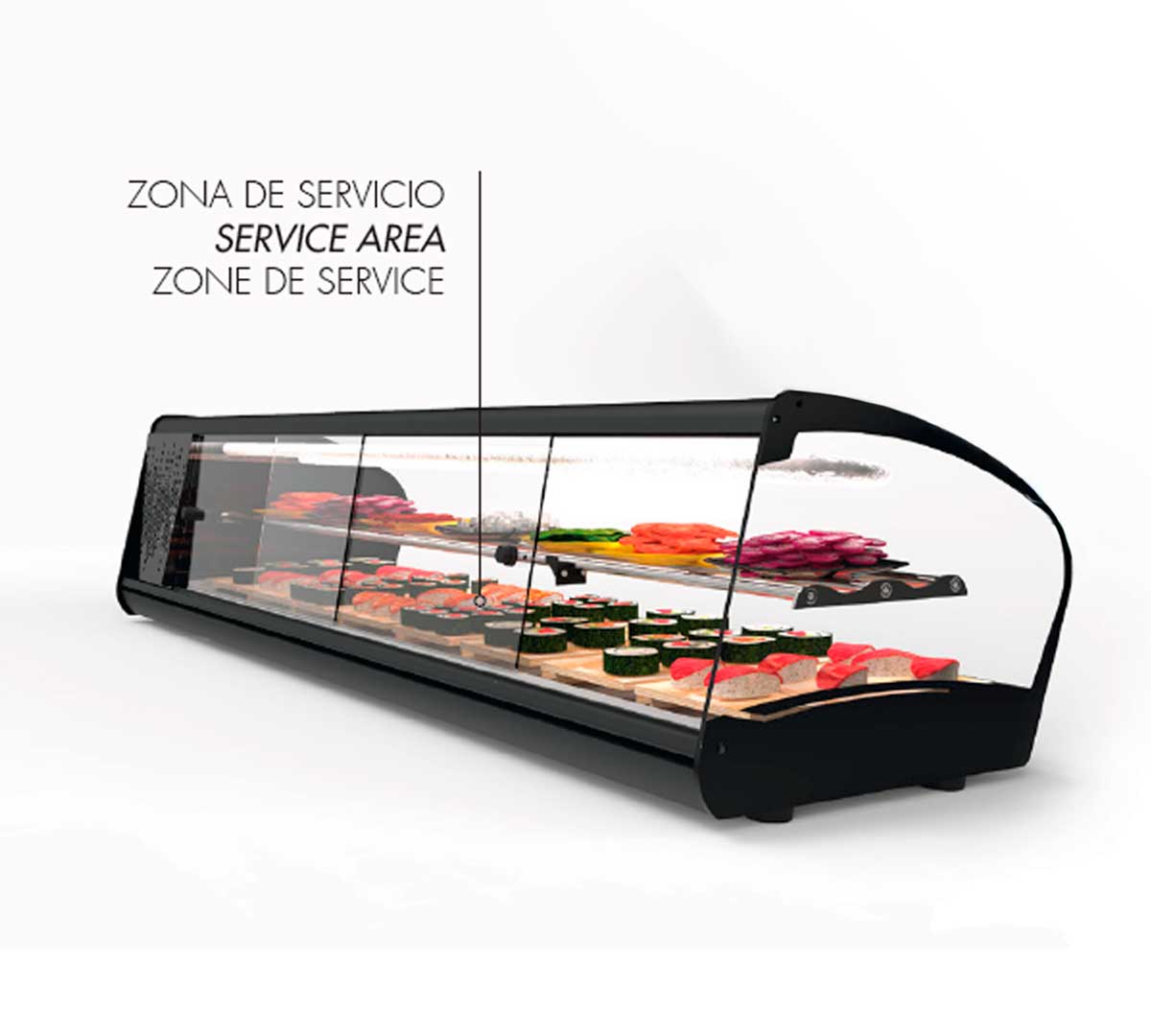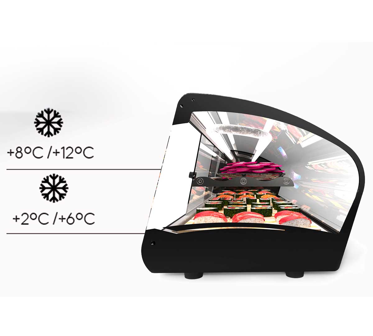 Vitrina Refrigerada de doble frío ideal para sushi. Tiene un exclusivo evaporador estático y placa fría. Incorpora un estante de acero de temperatura neutra. La zona inferior tiene una temperatura de +2 a + 6 ºC y la zona superior de +8/+12 ºC.