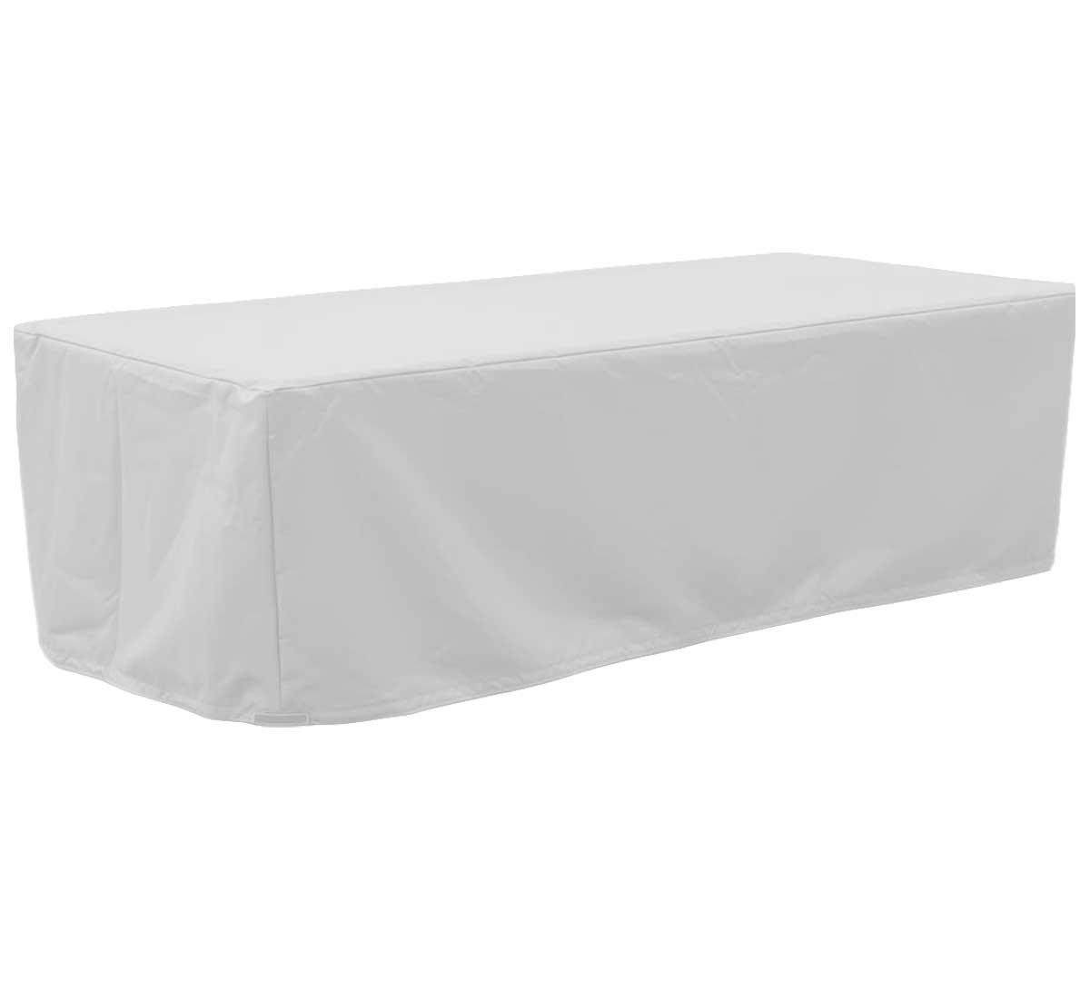 Funda protectora impermeable y reciclable para mesa y sillas, con ajuste mediante cuerda y regulador. Acabado mate, fabricación estándar o a medida y garantía de 3 años.