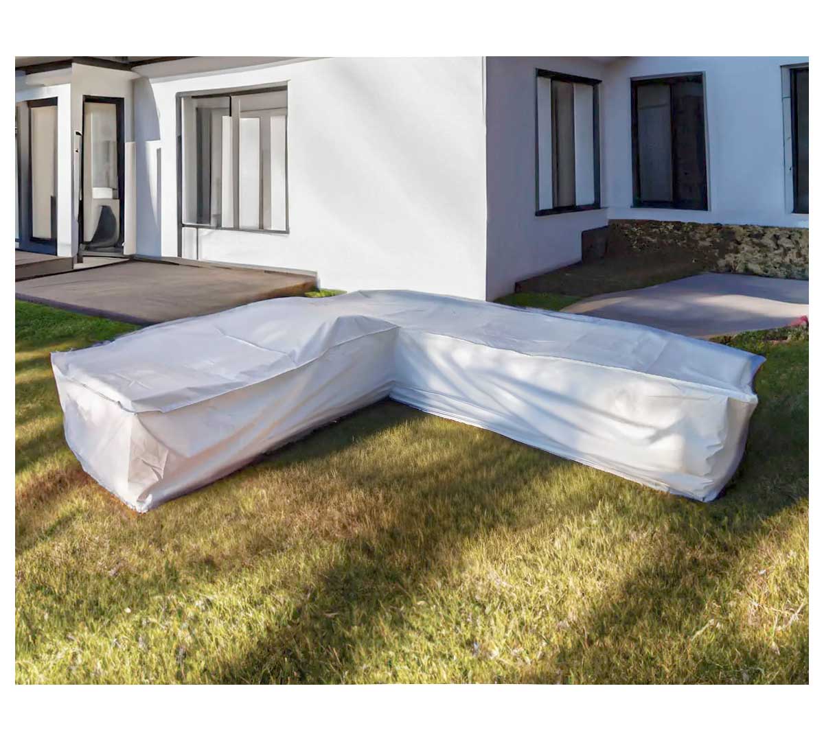 Esta funda está especialmente indicada para proteger conjuntos de sofá en "L" ubicados en terrazas, jardines o espacios exteriores, evitando el deterioro causado por la exposición al sol, la lluvia o el polvo. Es ideal para mantener en perfecto estado el mobiliario de exterior durante periodos de inactividad o en temporadas de climatología adversa.