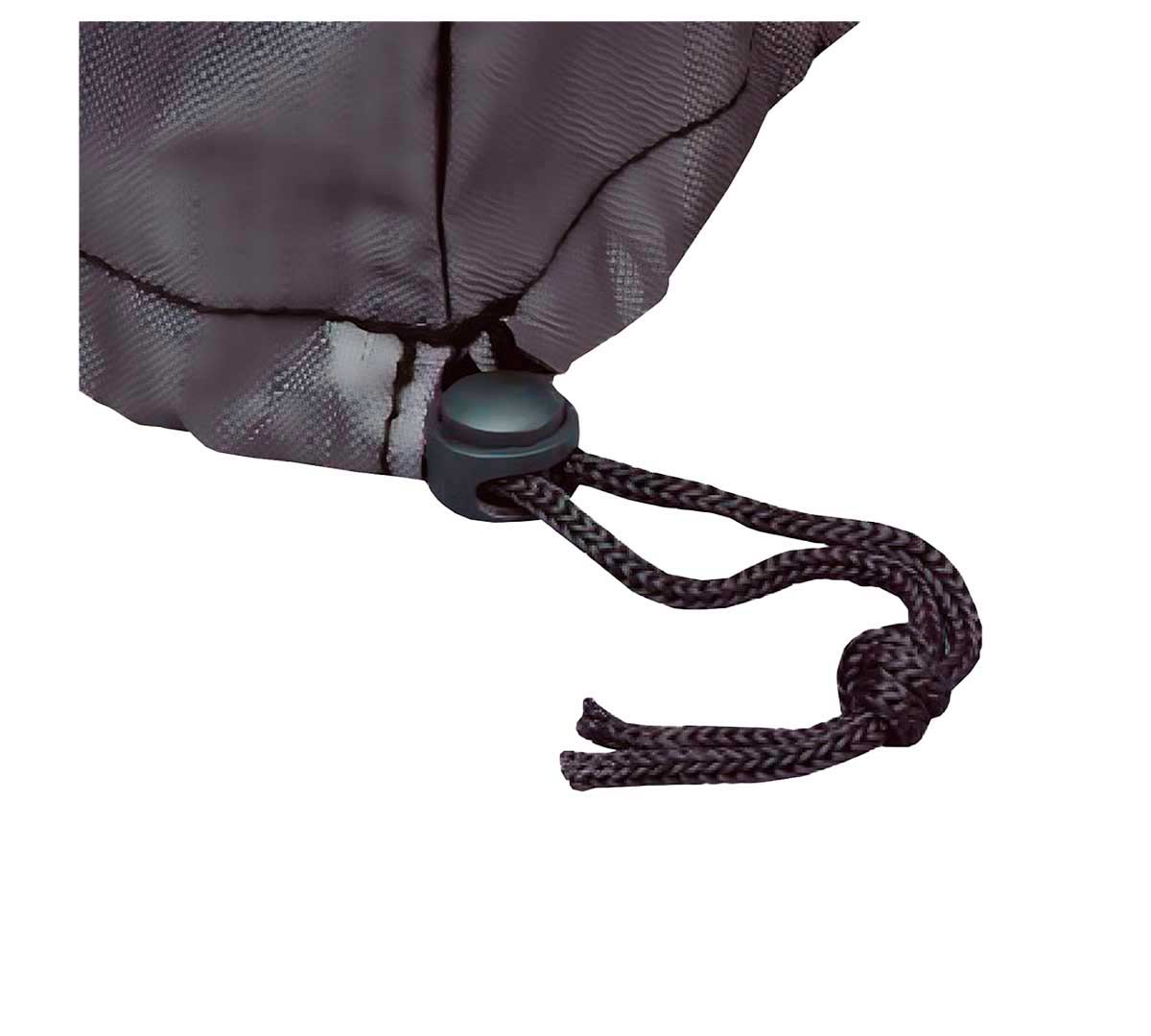 Estas fundas incorporan un sistema de ajuste mediante cuerda y freno que permite fijarlas firmemente al mobiliario, ofreciendo buena sujeción contra viento moderado y evitando desplazamientos en uso habitual en exterior.