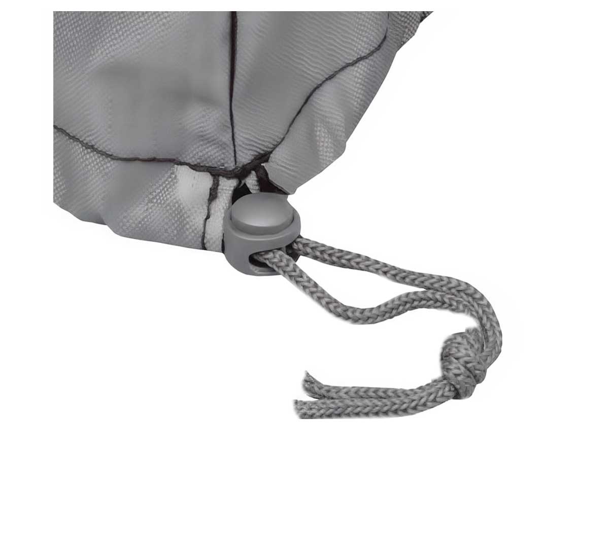 Funda de poliéster Ripstop impermeabilizado, con costuras selladas y ajuste mediante cuerda y freno. Tejido reciclable, disponible en varios colores y medidas estándar.