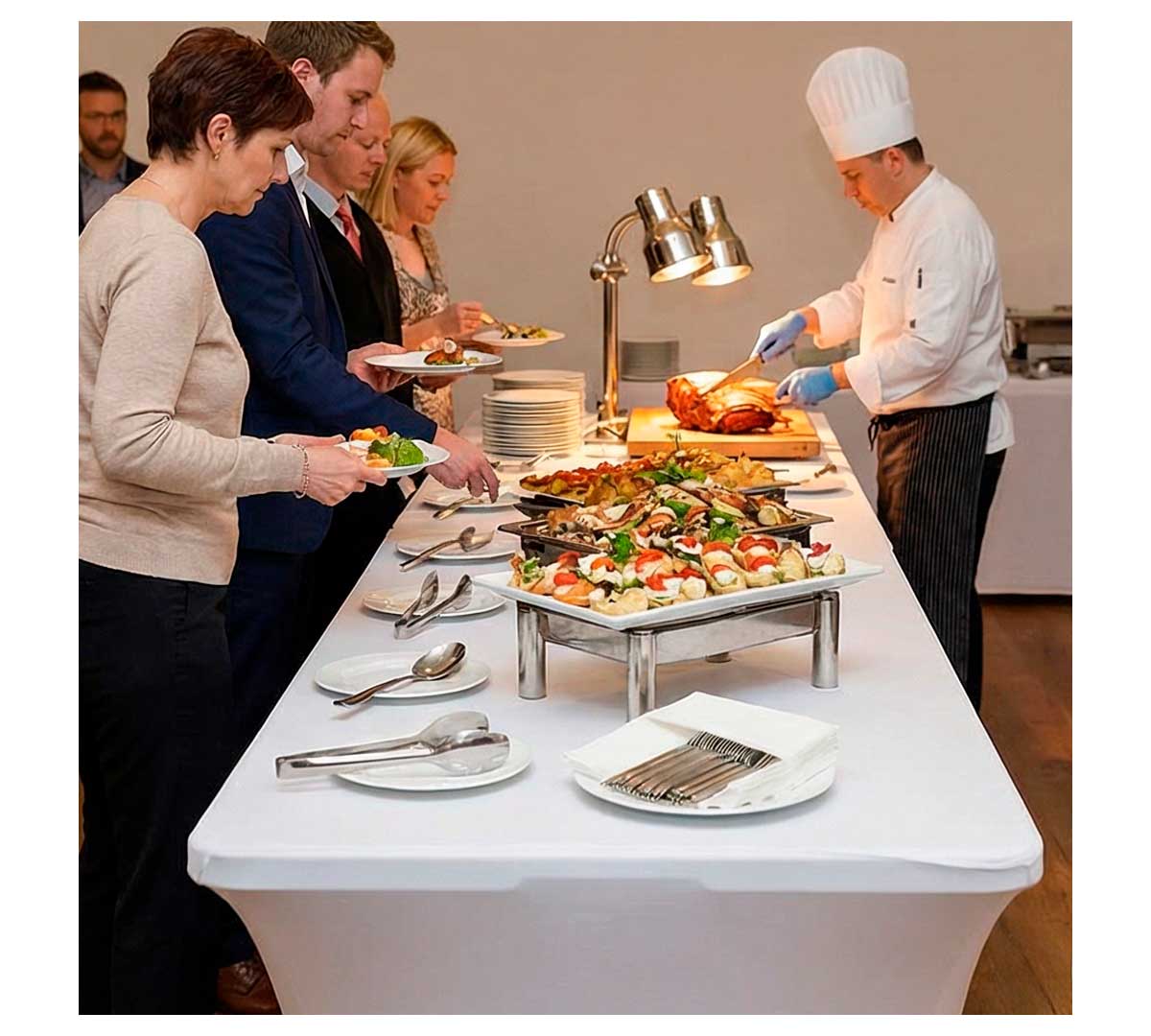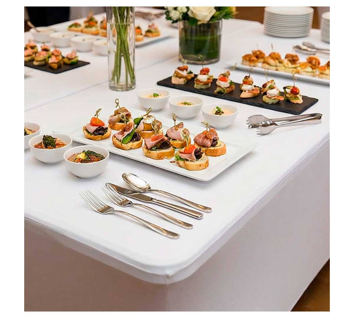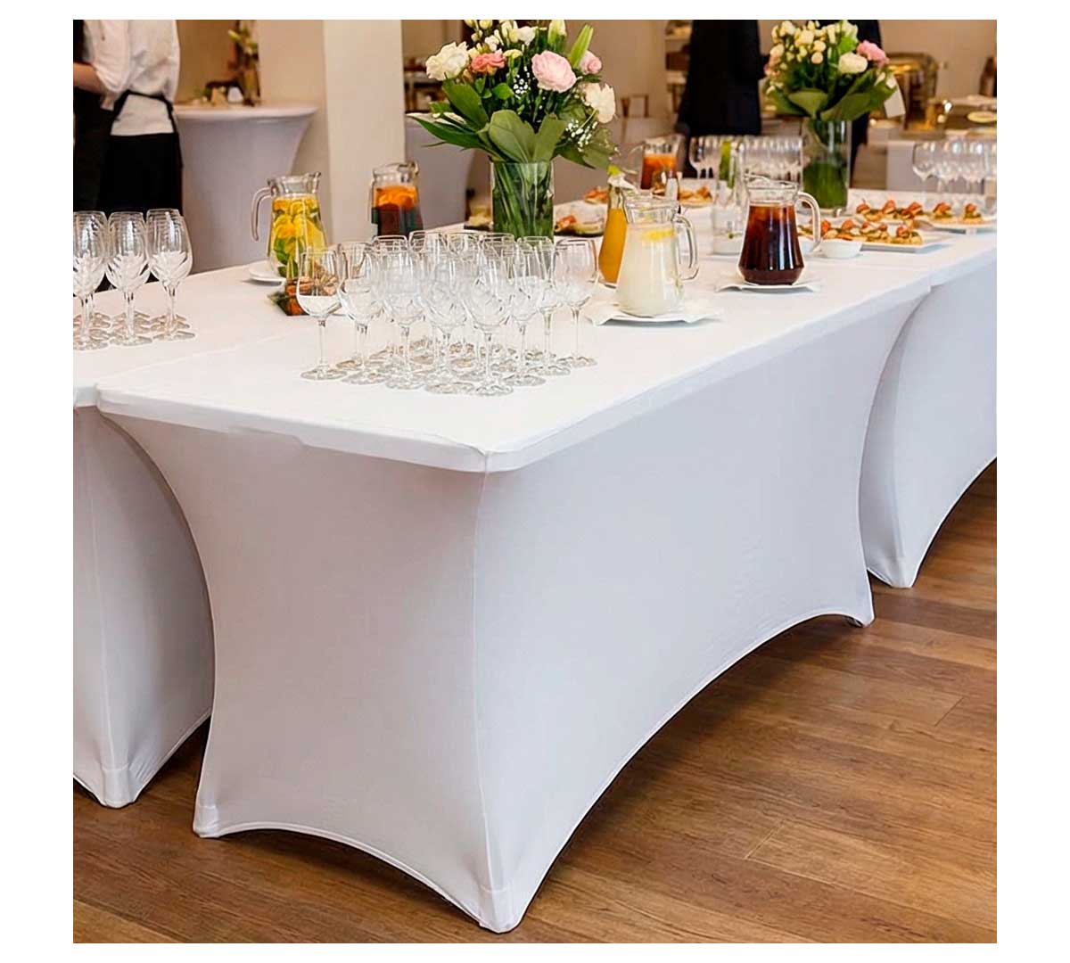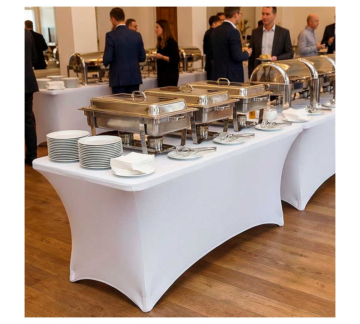 Funda elástica profesional diseñada para cubrir mesas de gran formato en eventos y Hostelería, aportando una imagen elegante, ajuste perfecto y rápida instalación en montajes imperiales y banquetes.
