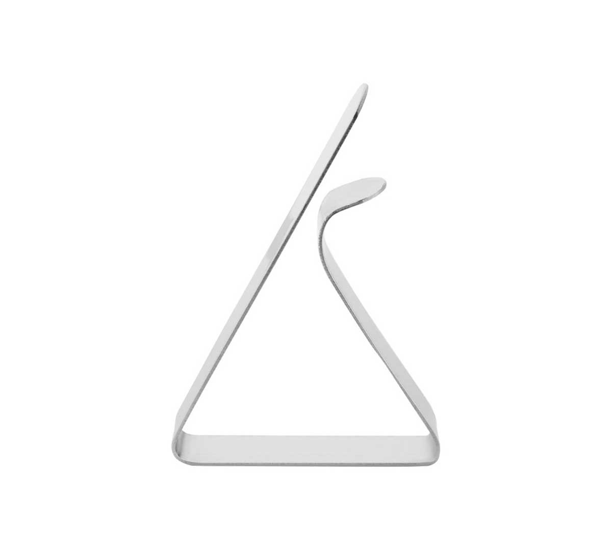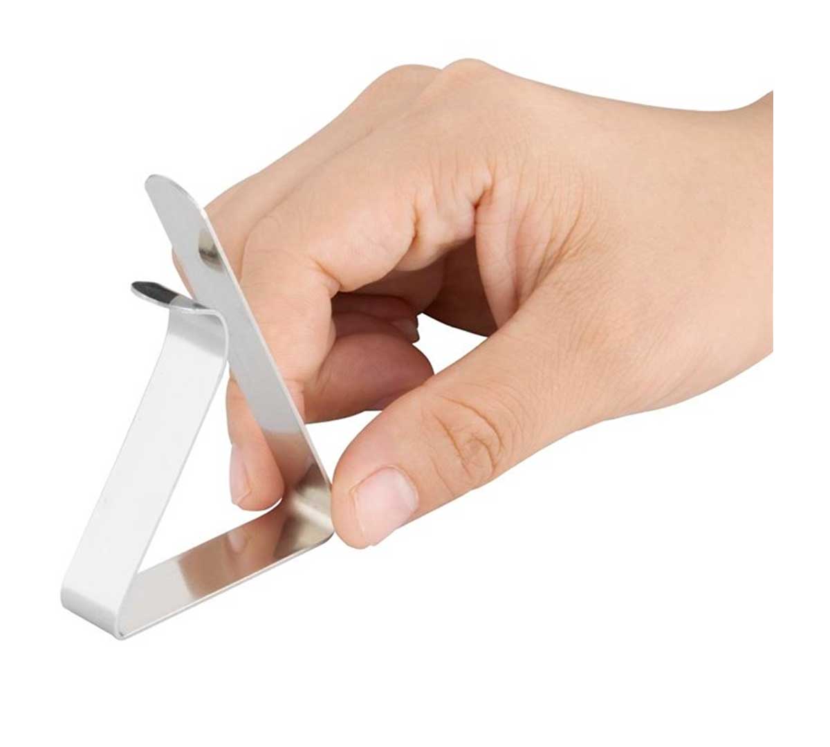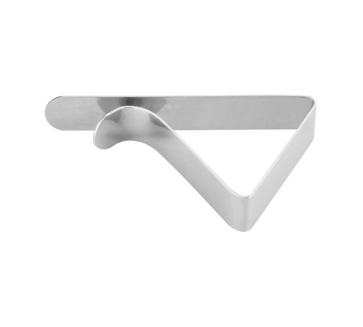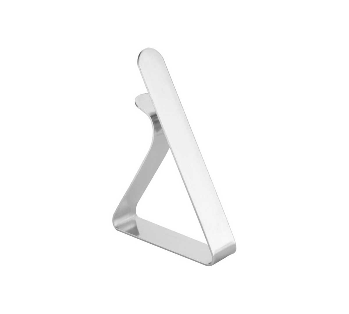 Clips de mesa Olympia de acero inoxidable diseñados para sujetar manteles de forma firme y discreta. Ideales para mesas de Hostelería, especialmente en terrazas y eventos al aire libre, evitando desplazamientos por viento o movimiento.